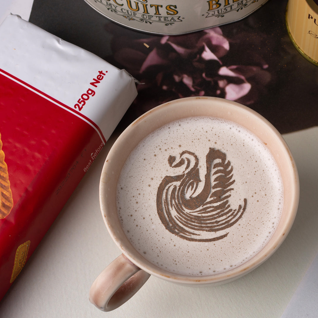 カップにステンシルを配置し、パウダーを振り掛けるだけで簡単にお家でラテアートが楽しめる商品です。