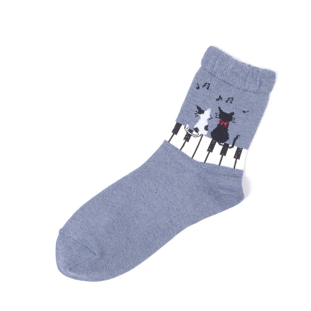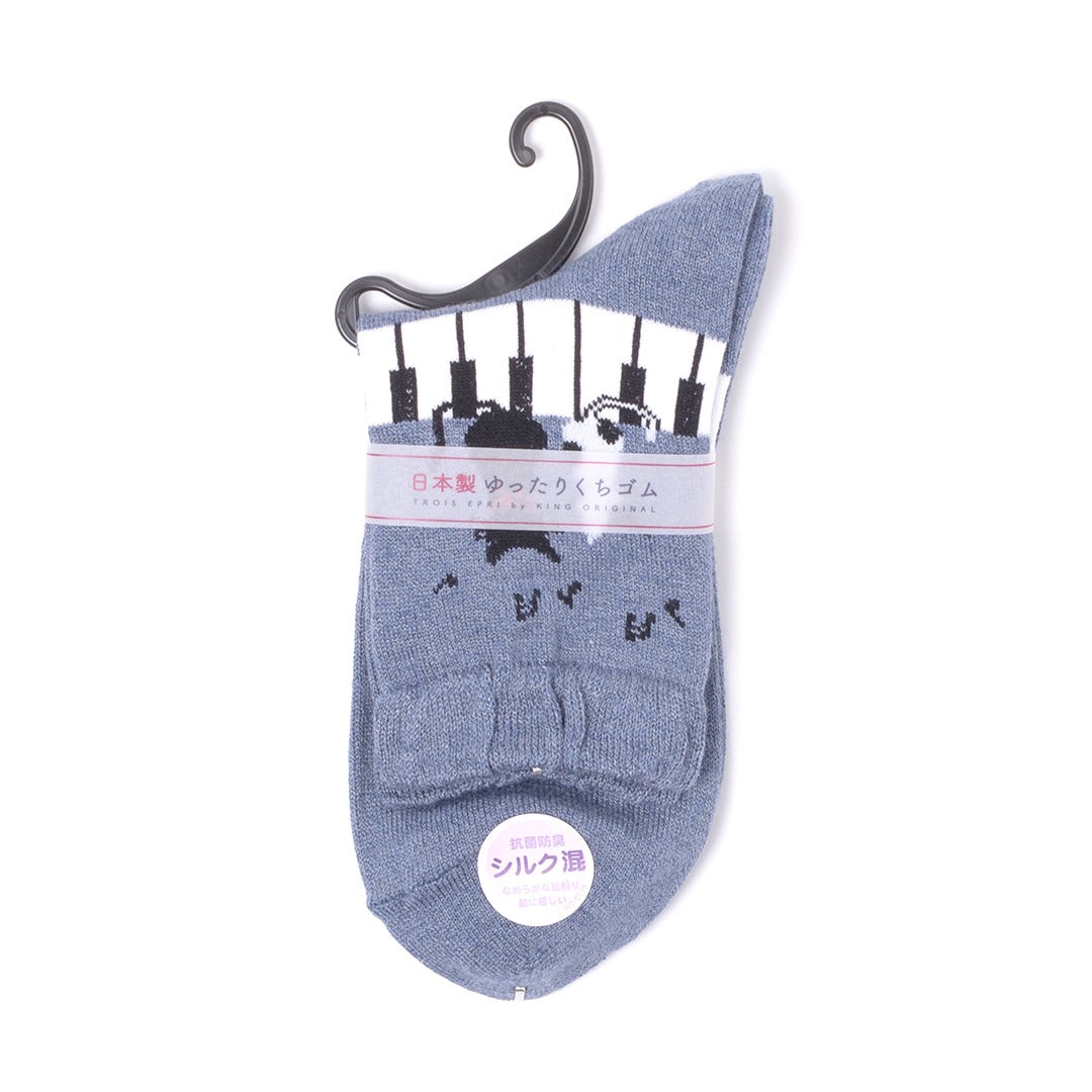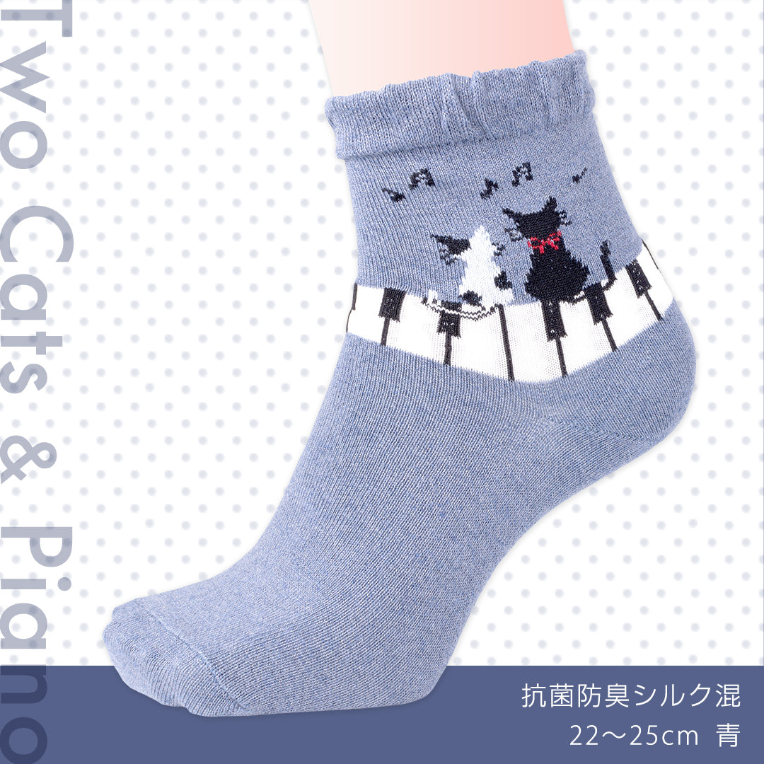 靴下 抗菌防臭シルク混 ピアノに2匹のねこ 22~25cm 青