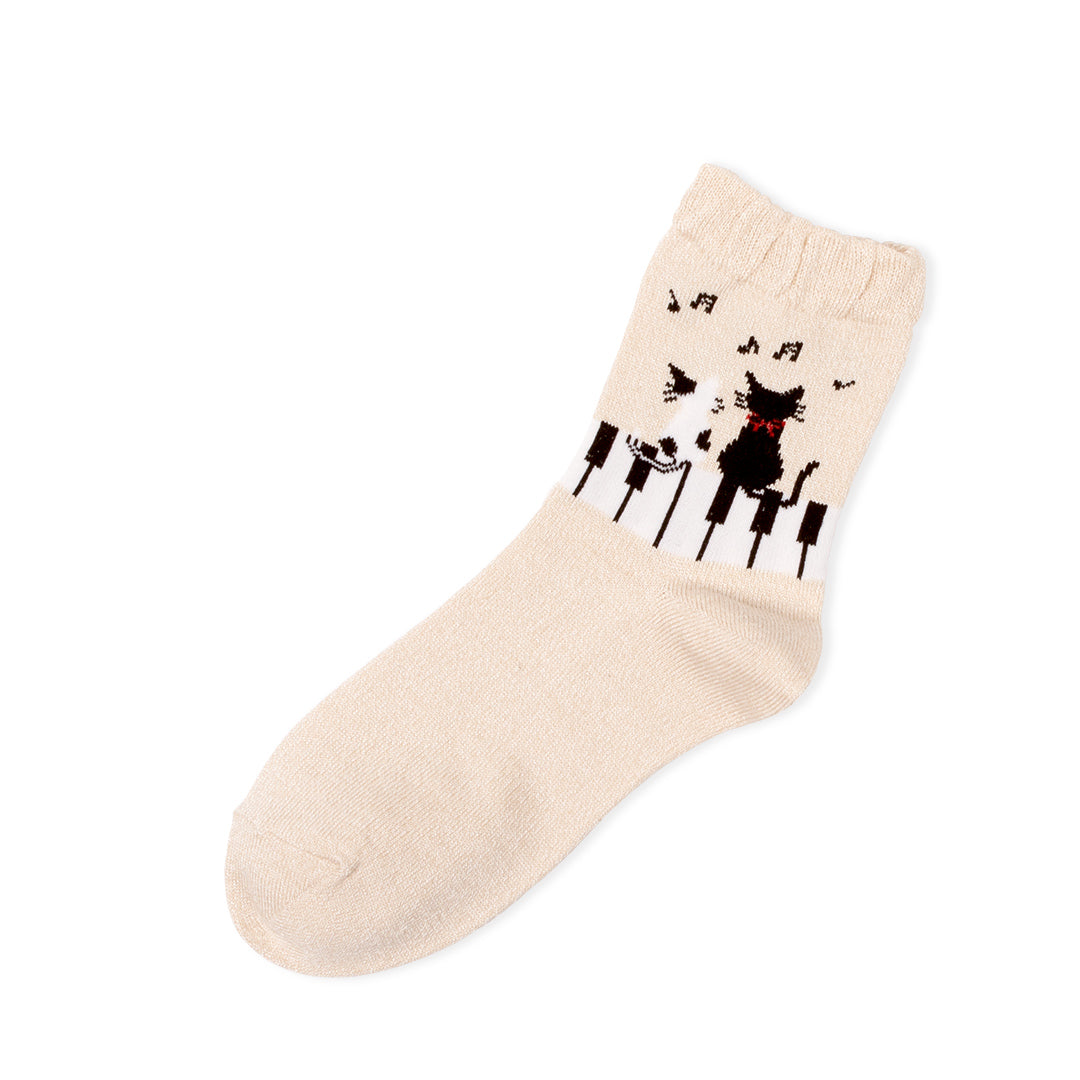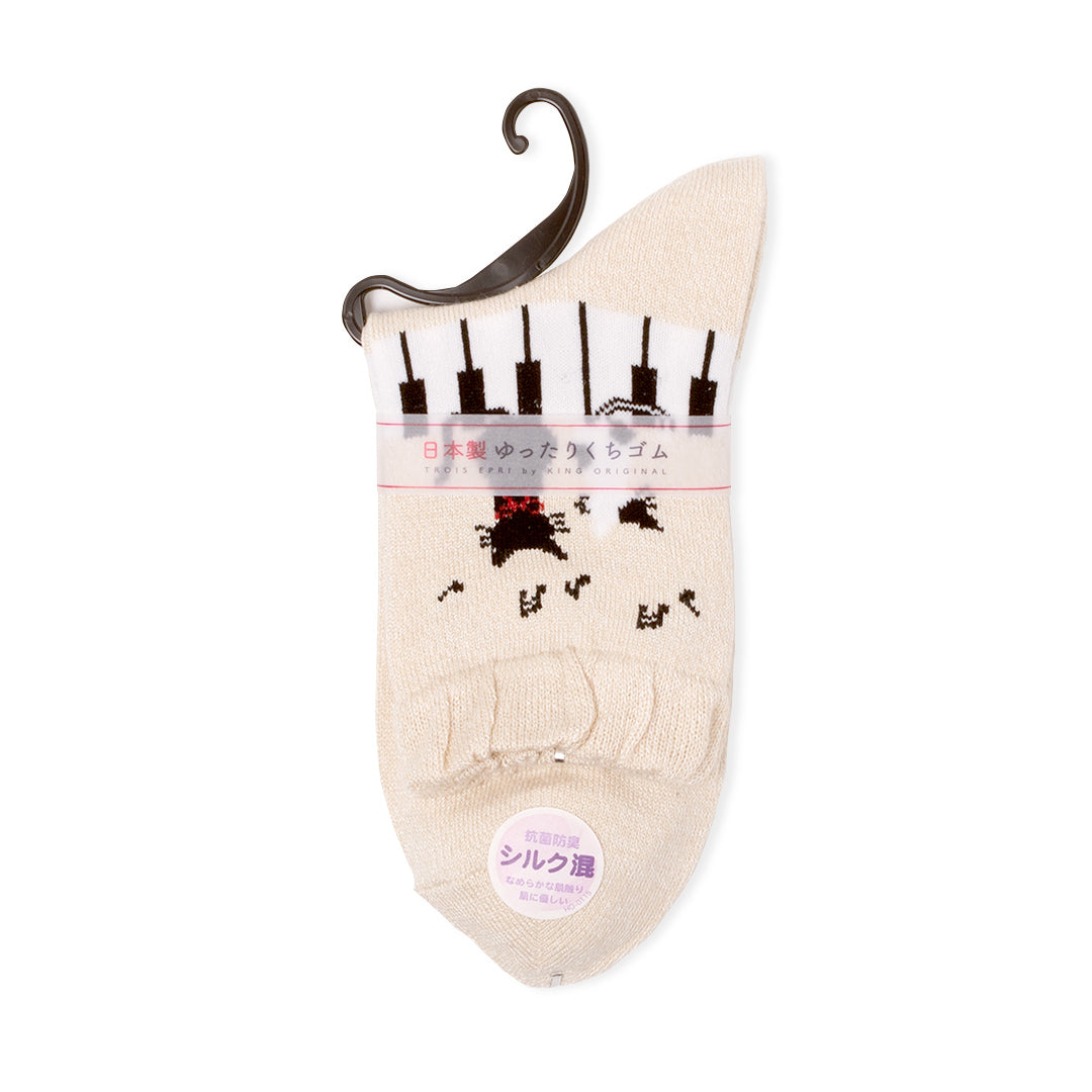 靴下 抗菌防臭シルク混 ピアノに2匹のねこ 22~25cm ベージュ