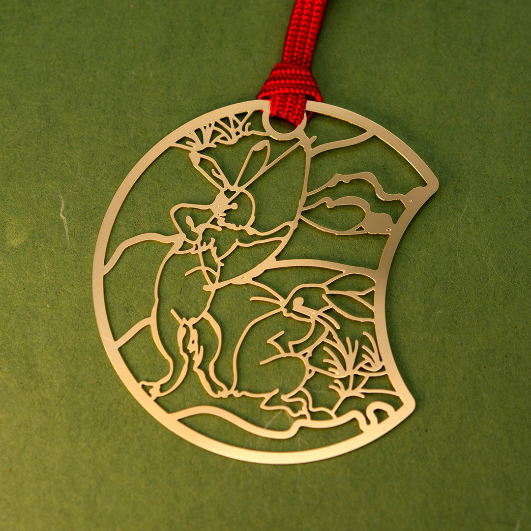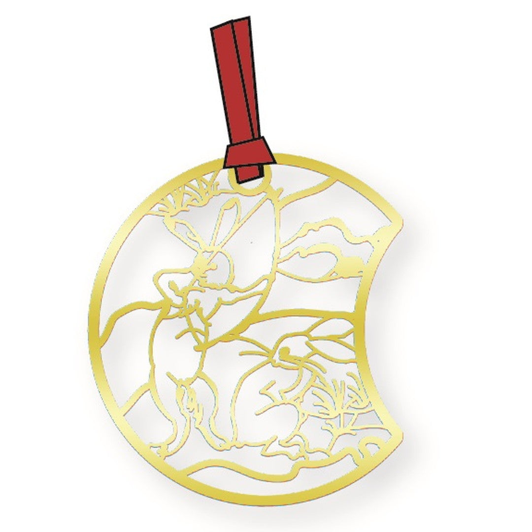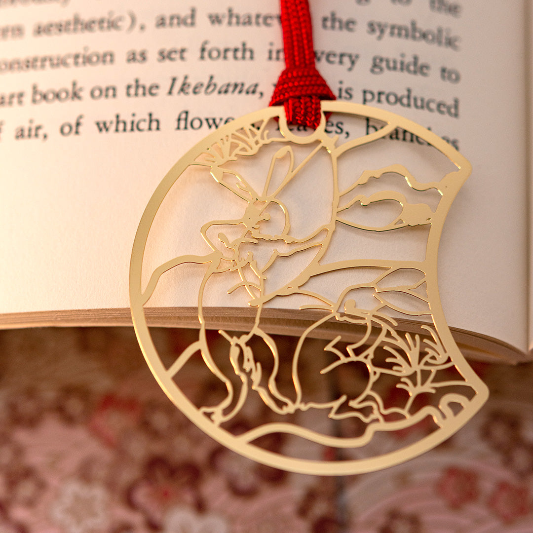 栂尾山高山寺に伝わる紙本墨画の絵巻物の鳥獣戯画に登場する兎や蛙等のデザインを用いた金のしおりです。