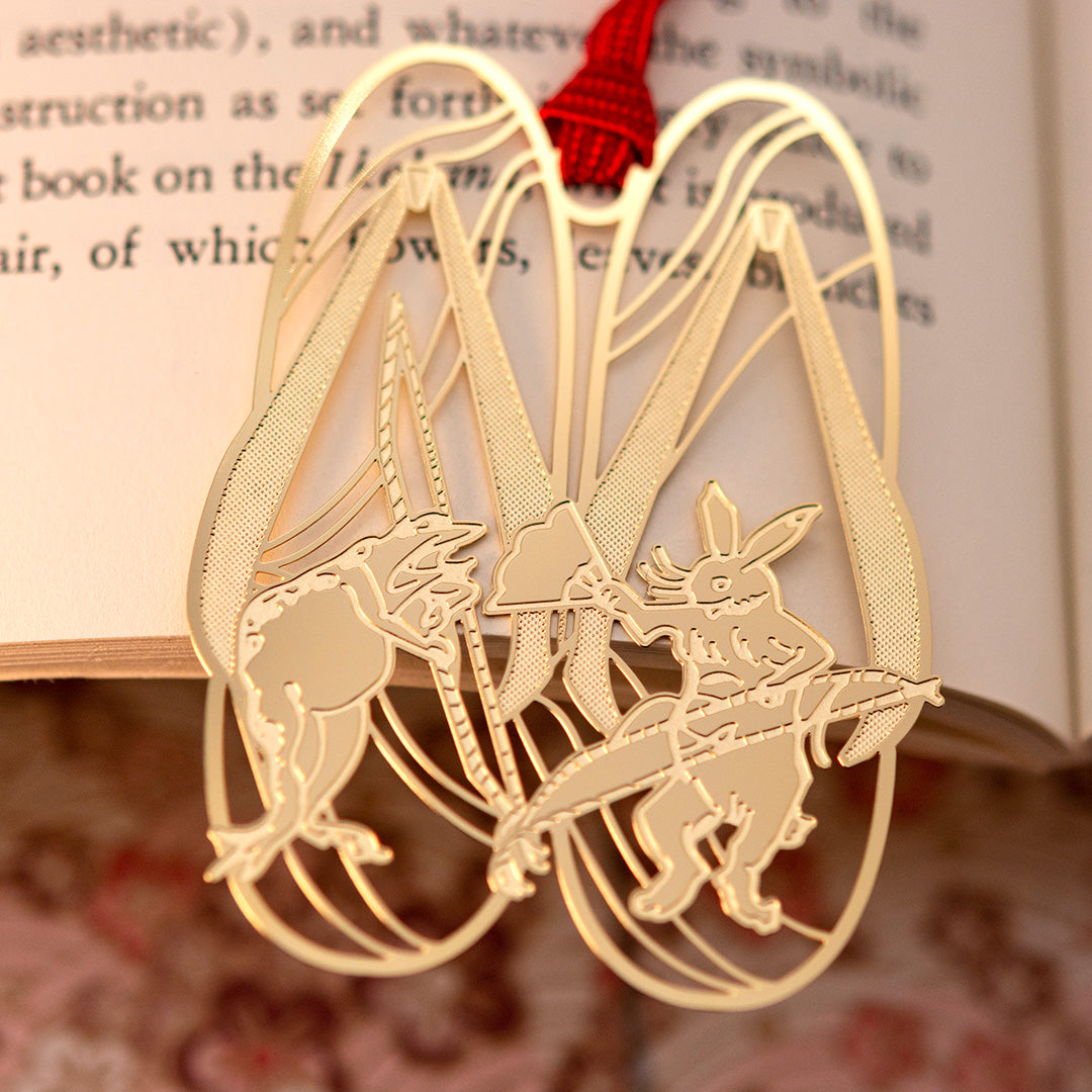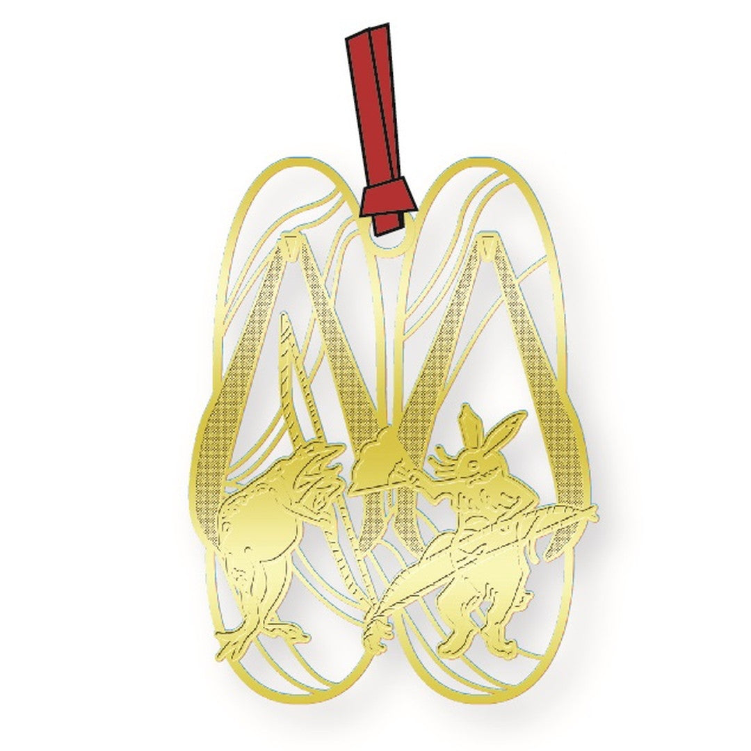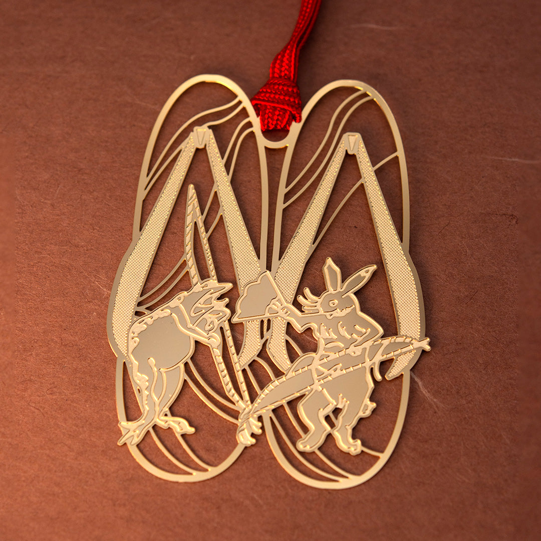 栂尾山高山寺に伝わる紙本墨画の絵巻物の鳥獣戯画に登場する兎や蛙等のデザインを用いた金のしおりです。