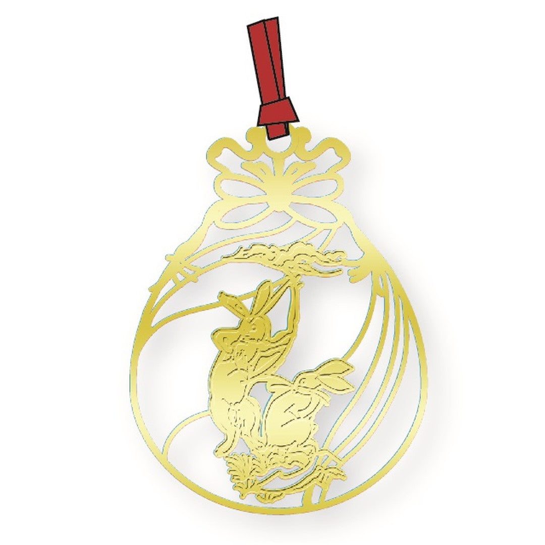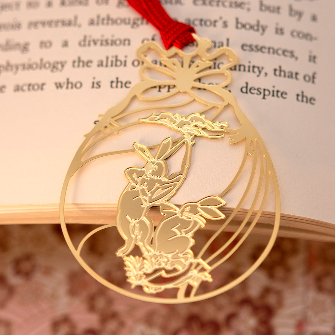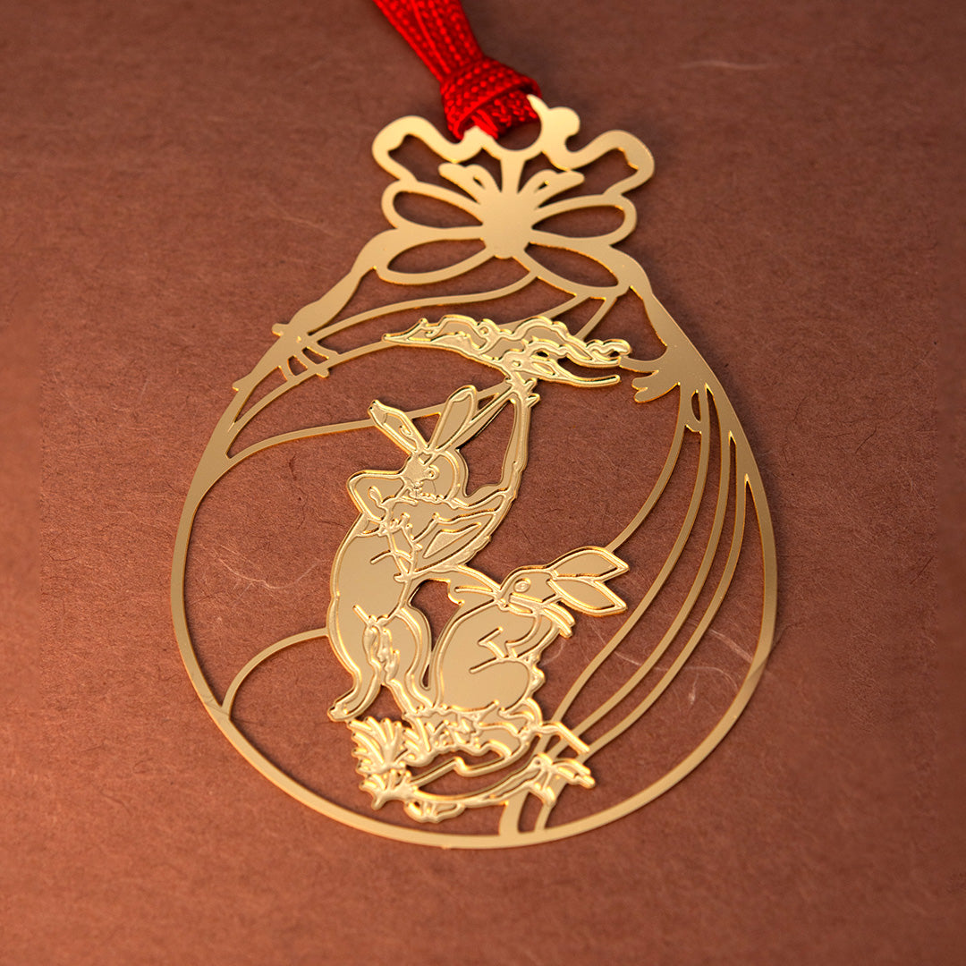 栂尾山高山寺に伝わる紙本墨画の絵巻物の鳥獣戯画に登場する兎や蛙等のデザインを用いた金のしおりです。