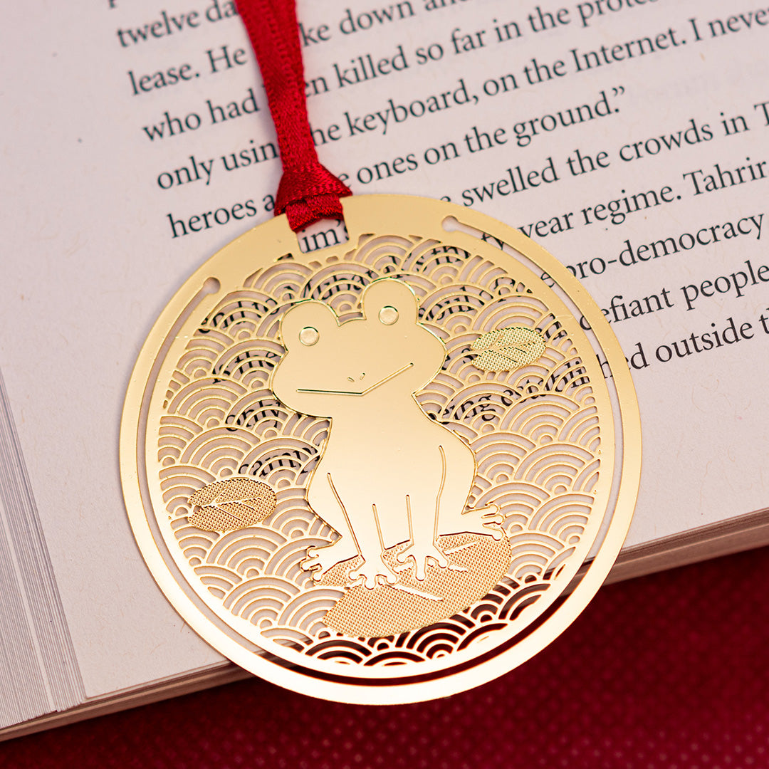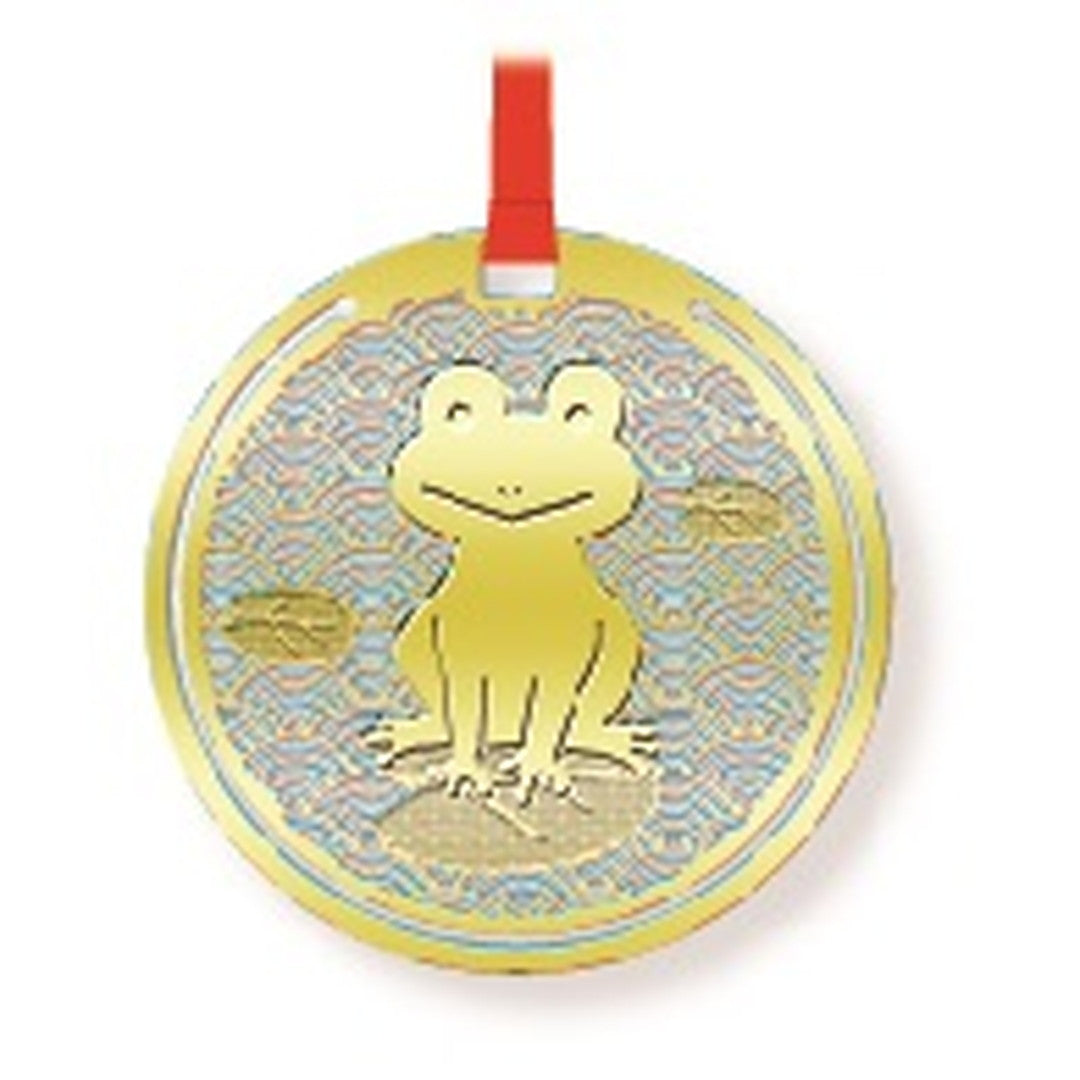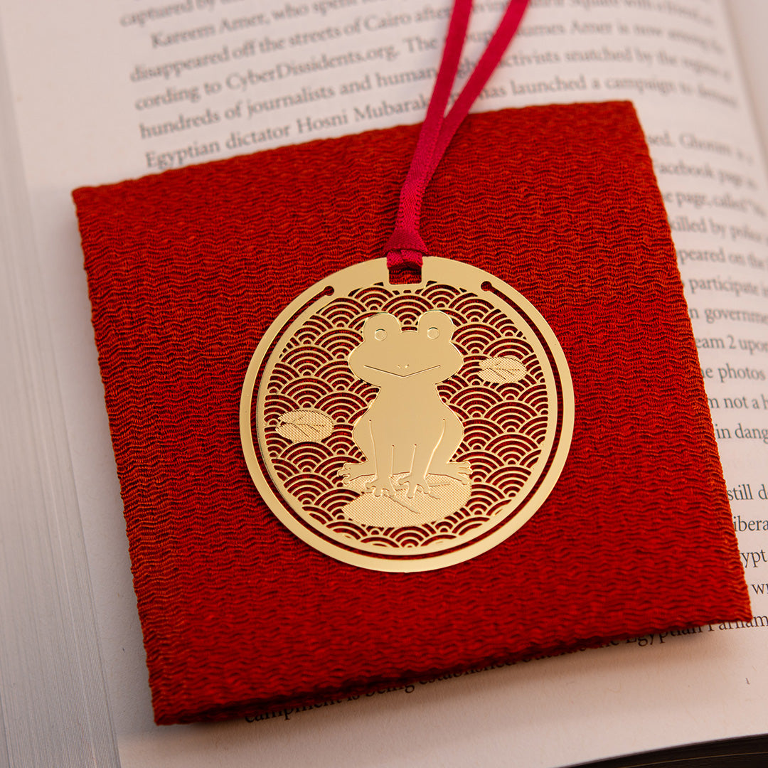 幸せを運ぶ縁起物をモチーフにしたしおりです。かえるは「交通安全」を意味します。